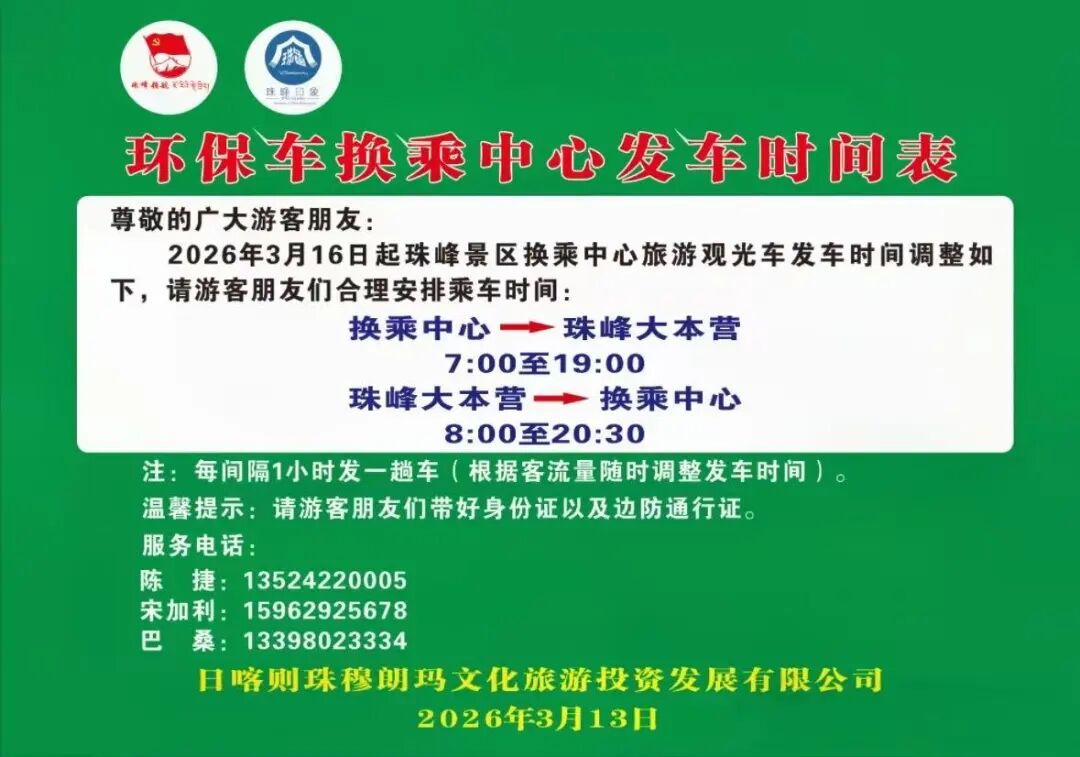 第八轮“冬游西藏”市场促进活动于2026年3月15日结束,珠峰景区于2026年3月16日00:00恢复正常收费,请游客朋友们提前做好安排。珠峰景区价格公示及旅游观光车发车时间表如下。