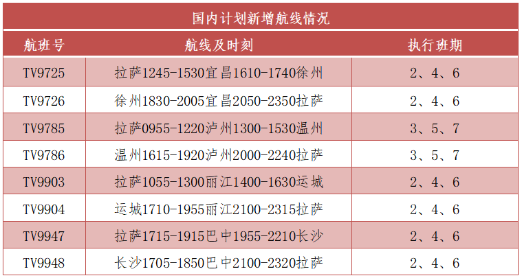 西藏航空新增多条国内航线,包括拉萨至运城、巴中、徐州、温州等航线。