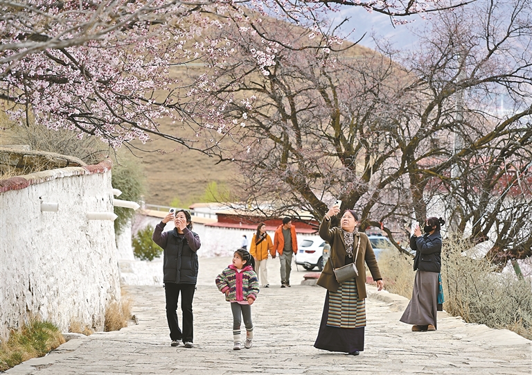 春日的帕邦喀,桃花竞相绽放,灼灼芳华铺满山间。粉白相间的花海层层叠叠,将古朴建筑掩映其中,勾勒出别样的诗意画面。游人漫步花海小径,或驻足赏花,或拿起相机定格美景,欢快的笑声与清幽的花香相互交织,奏响了高原春日里的动人乐章。