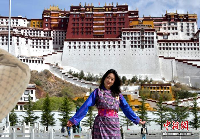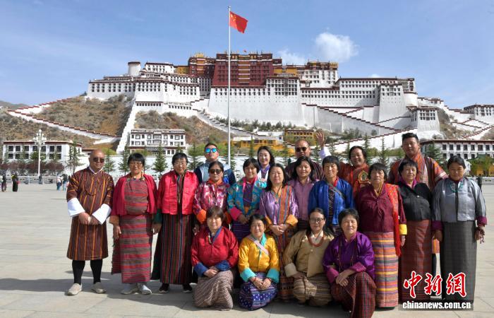 图为4月22日,来自不丹的游客在西藏拉萨布达拉宫广场合影留念。中新社记者 李林 摄