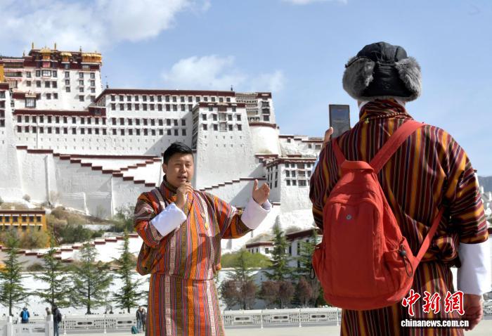 图为4月22日,来自不丹的游客在西藏拉萨布达拉宫广场拍摄视频。中新社记者 李林 摄