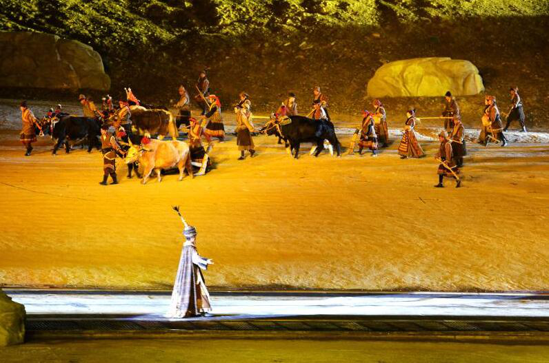 倒淌河边,公主摔碎宝镜;扬天飞雪中,进藏队伍逶迤前行;篝火升腾的百人锅庄,染红半壁宝瓶山……昨晚9时整,在山为幕布,星空点缀的舞台上,以文成公主入藏促进汉藏经济社会和民族文化相互交流的故事为主题的《文成公主》藏文化大型史诗剧上演。