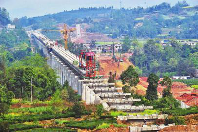 3月22日,川藏铁路成雅段全长1687米的猫庙河特大桥正在进行架梁施工。川藏铁路成都至雅安段自2014年底动工以来,经过紧张施工建设,隧道、桥梁等线上主体工程已基本完成,全线架梁铺轨、站房、接触网工程施工进入决战攻坚阶段。成雅段预计2018年底建成达到通车运营条件。 曹宁摄(视觉四川)
