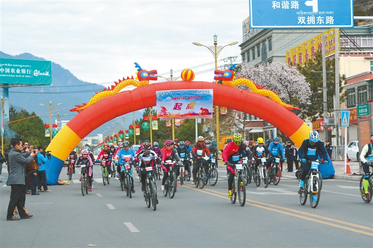 西藏林芝第十六届桃花旅游文化节“骑行尼洋河、寻访桃花源”自行车骑行赛现场。记者 潘璐 史金茹 摄