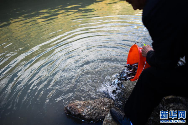 工作人员把鱼苗投入雅鲁藏布江中(摄影:普布扎西)