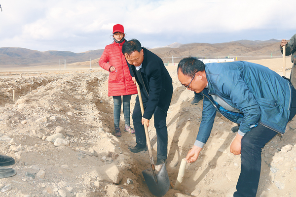 阿里地委委员、噶尔县委书记高宝军(中)带头栽树。(图片由噶尔县提供)