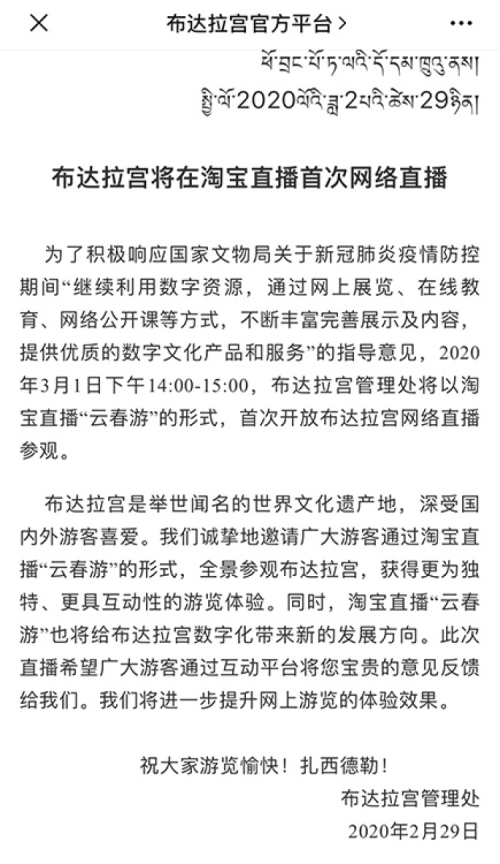 图为2月29日,布达拉宫官方微信平台发出的直播公告截图