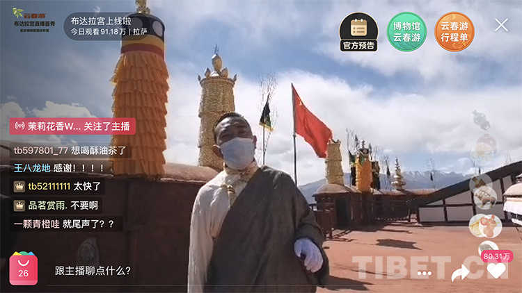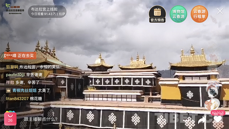 当日14时,布达拉宫首次通过网络直播的方式,为广大游客带来了一场“云游”。在一小时的直播过程中,记者发现共有近百万网友线上观看,80多万网友点赞。