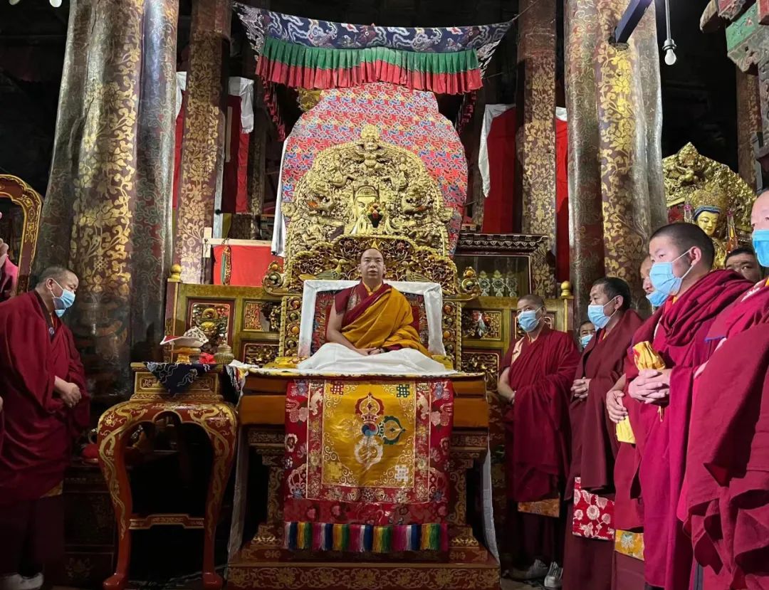 图为班禅端坐释迦牟尼佛像前的宝座,在领经师的伴领下念诵祈祷经文。记者 格桑吉美 摄