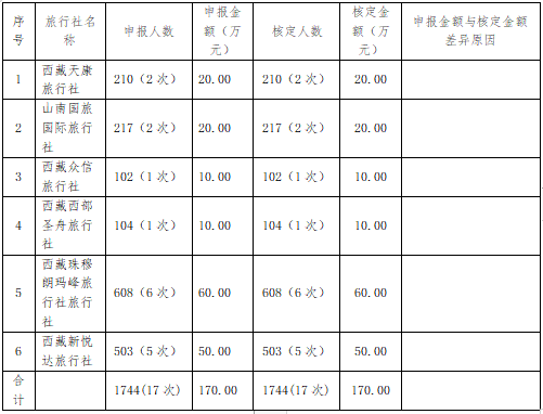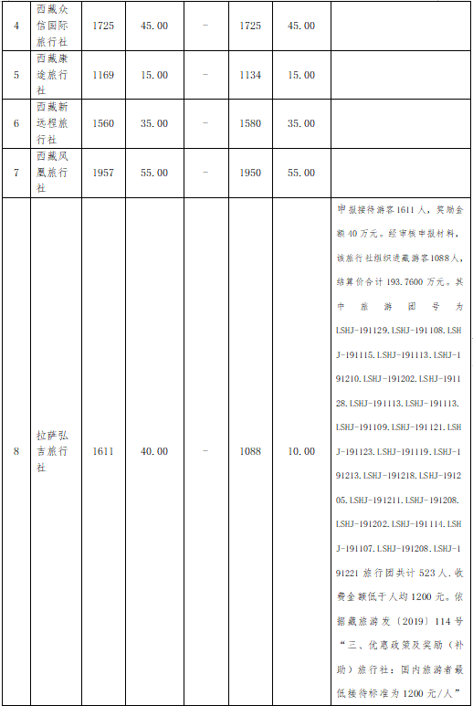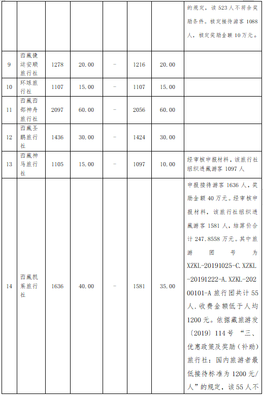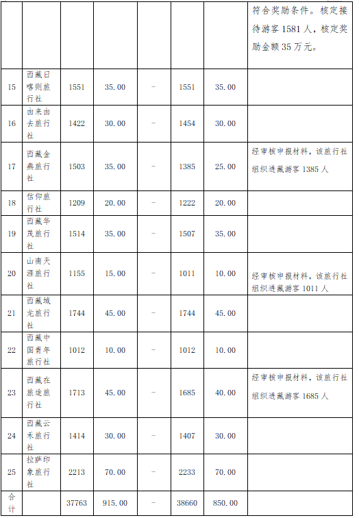 我们接受西藏自治区旅游发展厅的委托,根据西藏自治区旅游发展厅和西藏自治区财政厅联合下发的《今冬明春“冬游西藏”市场促进奖励(补助)优惠政策实施细则(试行)的通知》(藏旅游发〔2019〕114号)对29家旅行社提交的申报资料进行严格的审查。经研究,“一日游”不作为旅游包价产品,不纳入奖励范围;奖励旅行团日期为2019年10月15日至2020年3月15日;包价团最低标准为1200元/人;包机每班至少100人。经严格核实,25家旅行符合包价要求;6家旅行社符合包机规定要求。现将奖励名单予以公示,如有异议请在公示日期后15日内以邮件方式发送至1309920891@qq.com邮箱,或致电18980834404进行反馈。