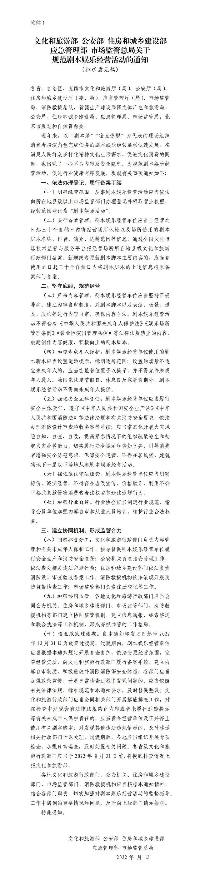 《文化和旅游部 公安部 住房和城乡建设部 应急管理部 市场监管总局关于规范剧本娱乐经营活动的通知(征求意见稿)》