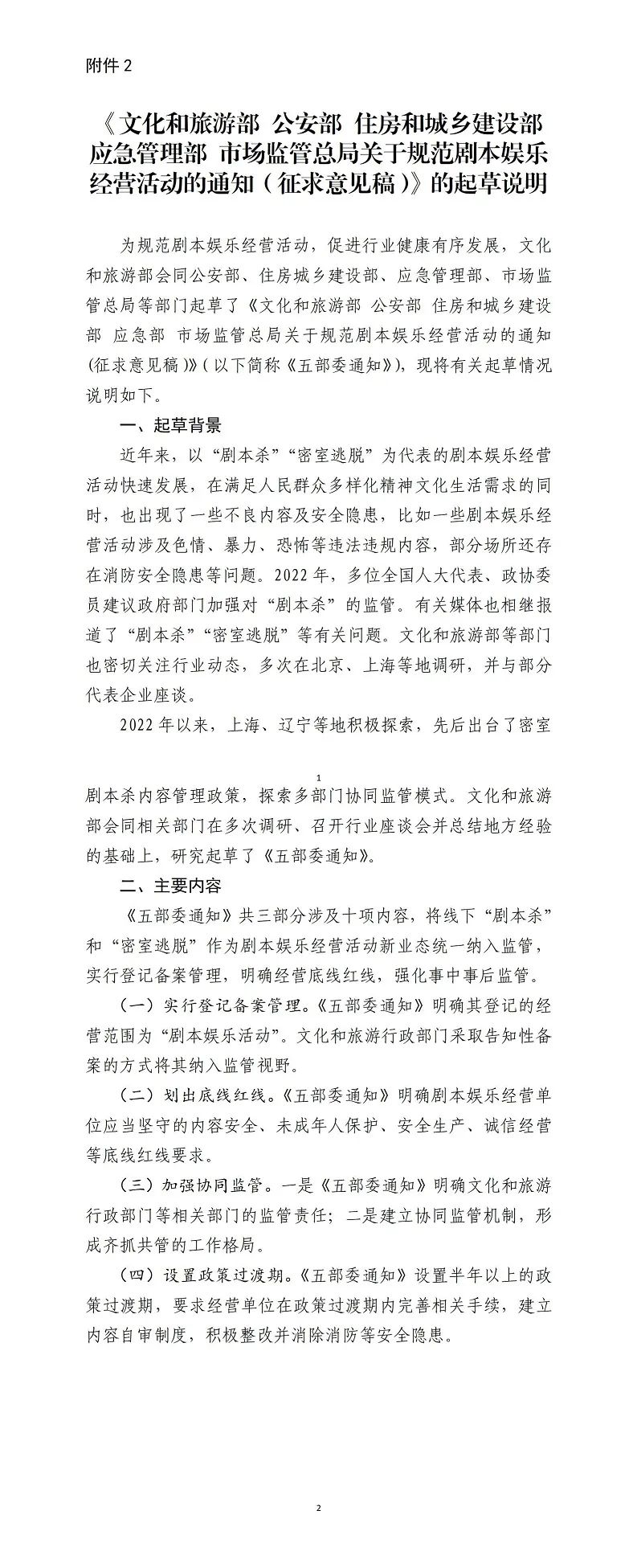 为规范“剧本杀”“密室逃脱”等剧本娱乐经营活动,促进行业健康有序发展,文化和旅游部、公安部、住房和城乡建设部、应急管理部、市场监管总局等研究起草了《文化和旅游部 公安部 住房和城乡建设部 应急管理部 市场监管总局关于规范剧本娱乐经营活动的通知(征求意见稿)》,现向社会公开征求意见。公众可通过以下途径和方式提出反馈意见:
