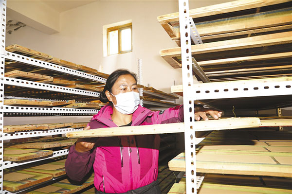 西藏罗宝藏药材开发有限公司员工尼玛在晾晒藏香。