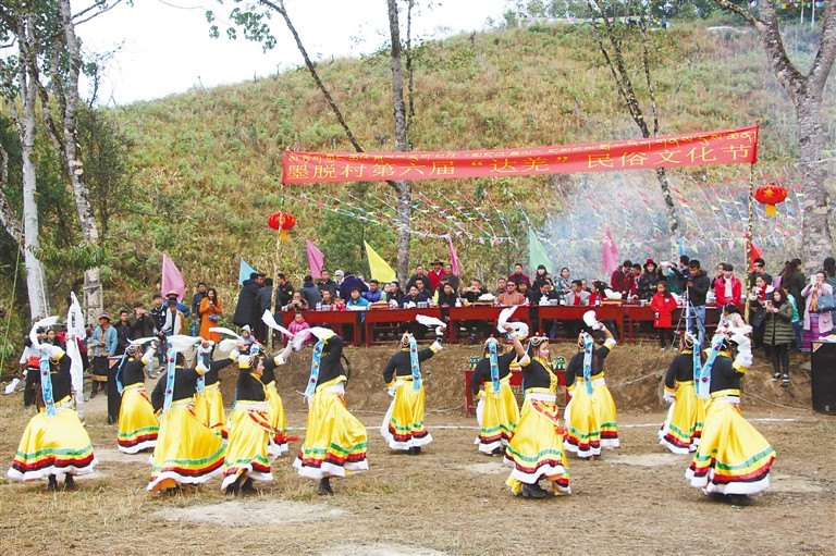 墨脱村村民跳起欢快的舞蹈,共同庆祝传统节日“达羌”。记者 潘璐 摄