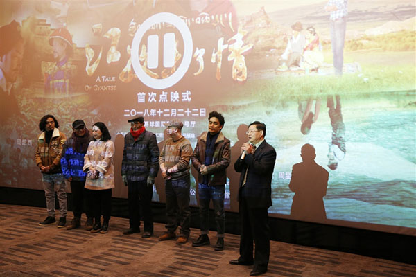 出品人、导演周韶西(右一)介绍影片《江孜未了情》。
