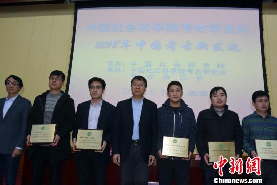中国社会科学院考古研究所所长陈星灿(中)向2018年中国考古六大新发现项目代表颁发奖牌。 孙自法 摄