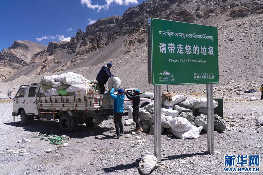 图为珠峰高山环保大队将从大本营收集到的生活垃圾装车,准备转运至位于定日县游客大本营的垃圾转运站(5月24日摄)。 新华社发(孙非摄)
