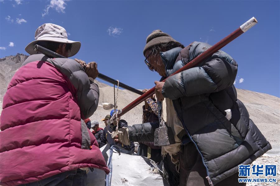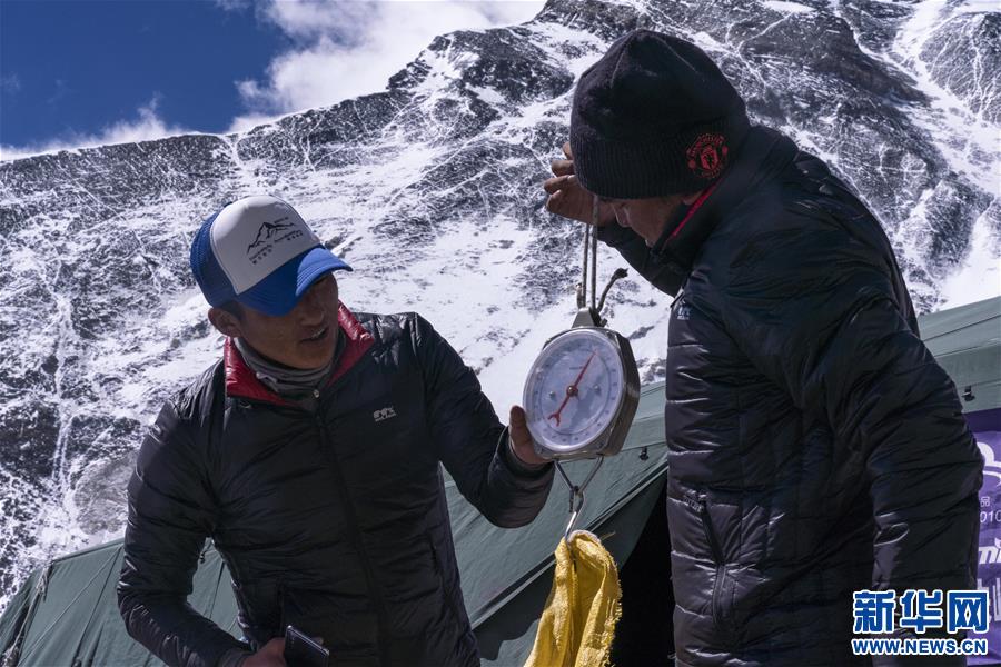 图为登山向导在珠峰海拔6500米的前进营地对登山垃圾进行称重(5月22日摄)。 新华社发(孙非摄)
