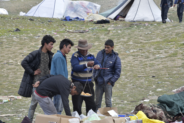 在次杰摊点不远的另一边,来自尼泊尔的商人扎西正在和小姑娘拉姆还价。今年是扎西来亚斯玛边贸市场进行贸易的第8年。
