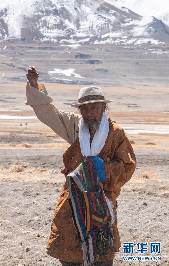 曲旺老人在西藏那曲市尼玛县当穹错旁举行的春耕典礼上播撒青稞良种(4月30日摄)。新华社记者 田金文 摄