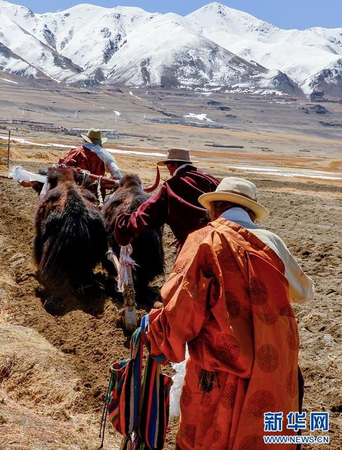 58岁的村民石秀扎多今年是第七次参加春耕赛马活动,经过4圈的角逐,今年他又获得了冠军,人们争先恐后地献上白色哈达,他和马很快就被哈达“淹没”了。 春耕赛马之后,就是传统的开耕仪式,村民们用传统的“二牛抬杠”方式耕田,81岁的曲旺老人跟在后面,洒下青稞良种。