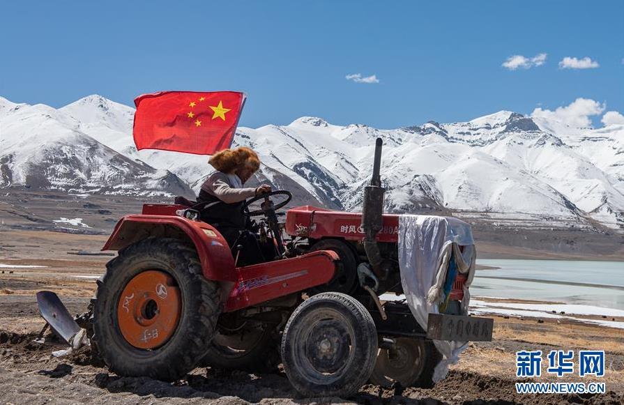 拖拉机在西藏那曲市尼玛县当穹错旁举行的春耕典礼上行进(4月30日摄)。新华社记者 侯捷 摄
