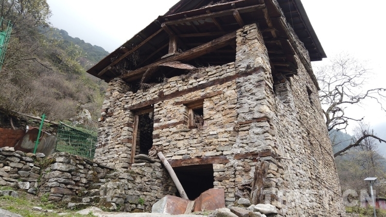图为勒布沟“央卡尔”碉楼遗址,石木结构,共5层,距今已有150年历史