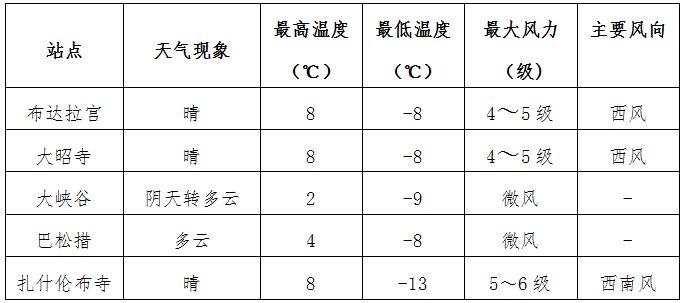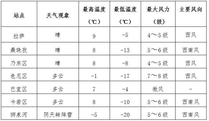 拉萨市区今天夜间到明天白天晴 ,西风4~5级,气温零下5度到9度。空气质量优;早晚体感温度低,请注意保暖,避免感冒;午间紫外线强,户外人员请做好防晒措施;午后易出现4~5级阵风,请做好防风措施。明天藏历11月27日。