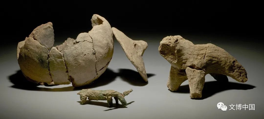 出土带盖陶钵、铜皮制牦牛、泥塑熊形动物