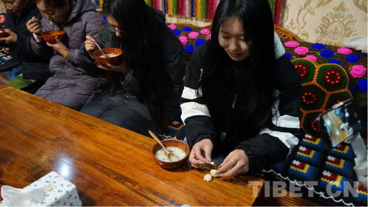 图为次仁德琼的二女儿格桑罗吉吃出了带有“花椒”字条的面疙瘩,寓意“嘴不饶人” 摄影:张晓琪