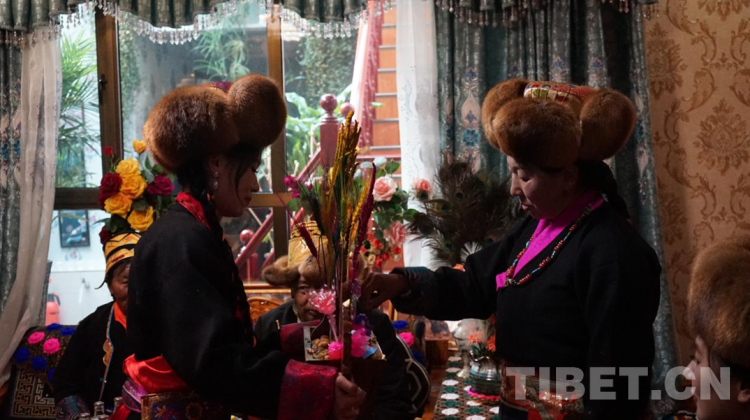 图为次仁德琼的大女儿其米曲宗正在向莫啦古桑白姆递上“卓玛摘丝”。 摄影:张晓琪