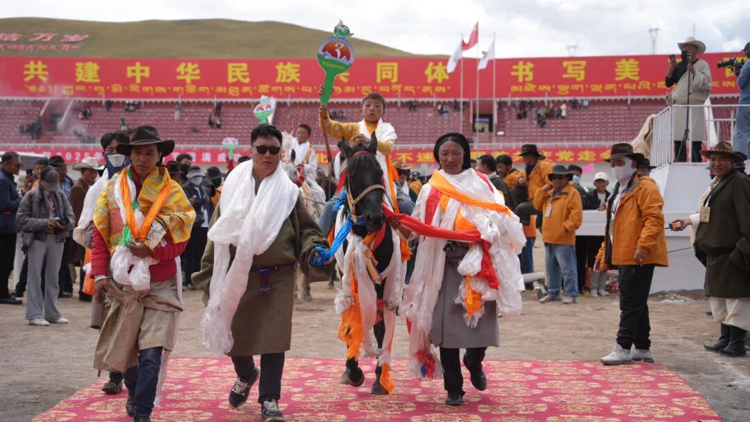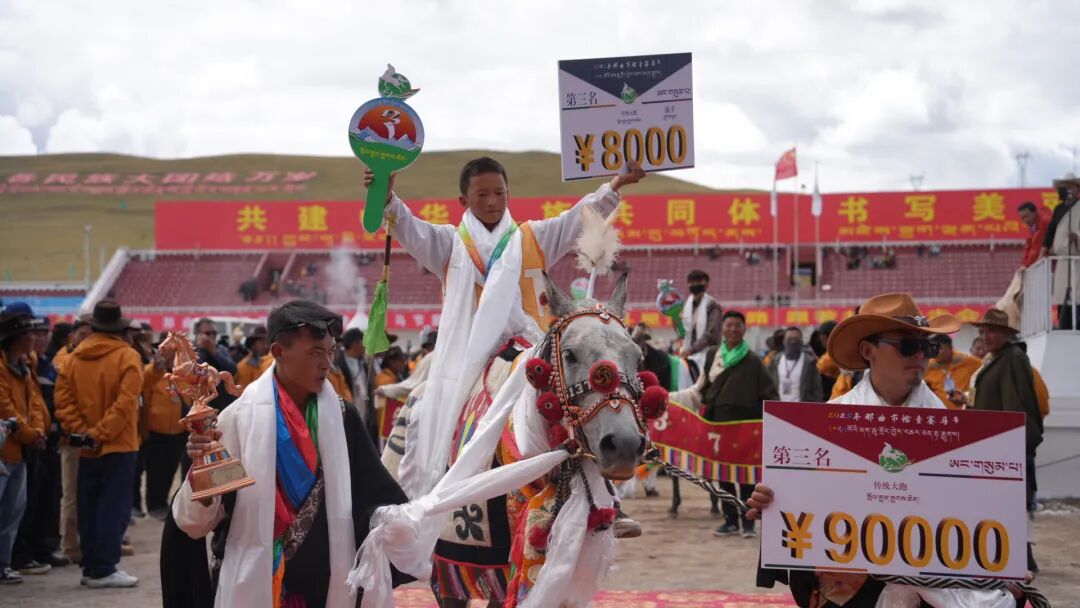 经过近半小时的激烈角逐,来自色尼区达前乡的骏马红豹率先冲过终点,摘得本次传统大跑项目冠军。随后,亚、季军也相继产生,获奖骑手与马匹在观众的簇拥下接受哈达与祝福,脸上洋溢着自豪的笑容。