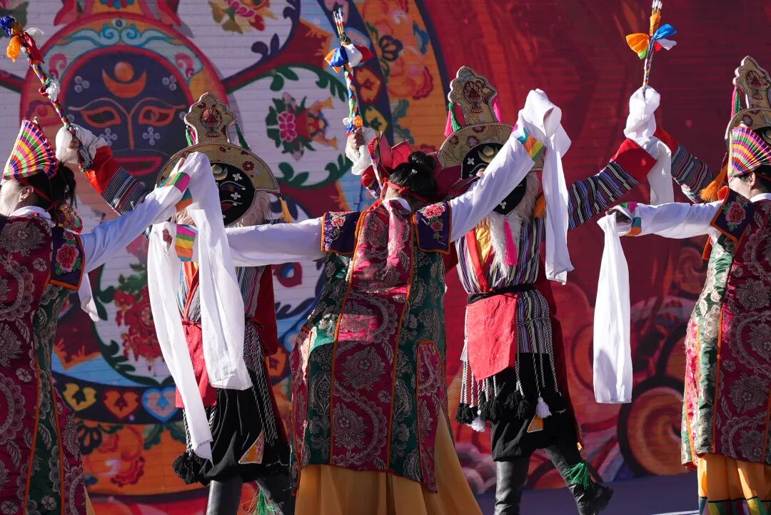 此外,恰瓦行政文艺演出队带来的舞蹈《幸福生活》,通过复刻传统氆氇编织劳作场景,生动展现高原儿女安居乐业的生活之乐;县艺术团演绎的国家级非物质文化遗产“土布加谐钦”核心精华片段《金色谐钦》,以庄重典雅的舞姿寓意生活顺遂安康、县域发展蒸蒸日上,赢得现场阵阵掌声。