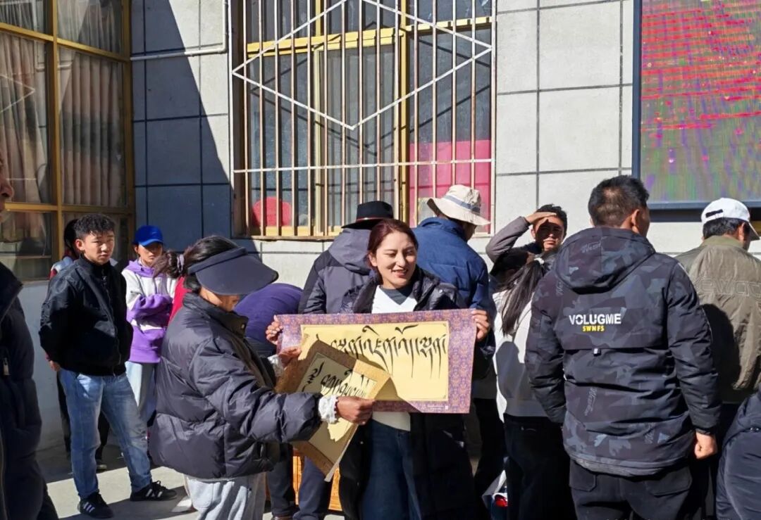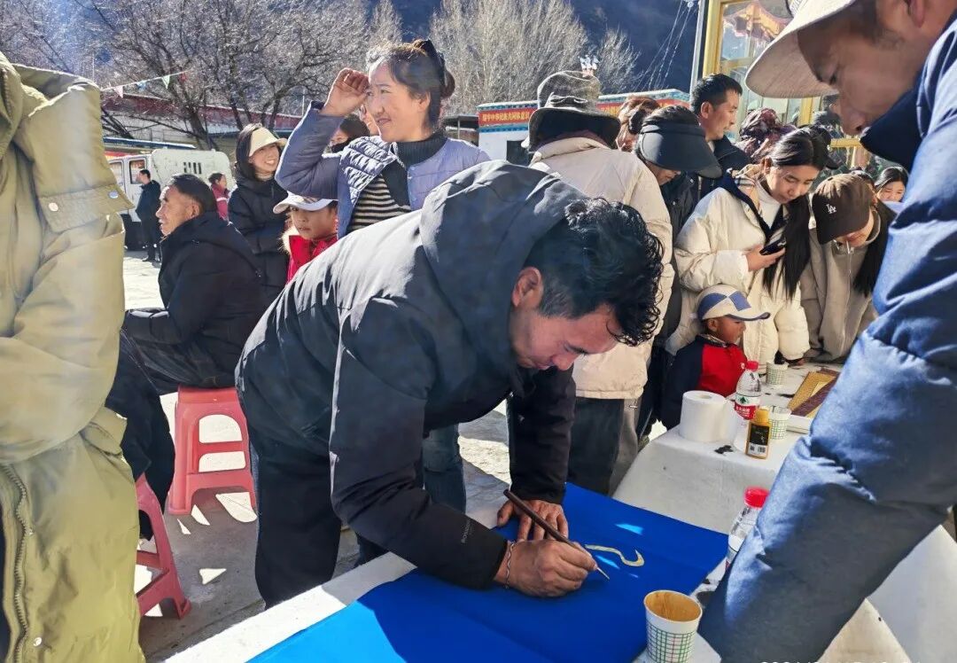 活动现场,书法家们凝神挥毫,笔走龙蛇,将沿江藏历新年吉祥寓意与中华传统春联文化、民族团结内涵相结合,挥毫书写“民族团结一家亲”“文明新风润乡村”等主题春联与福字,免费赠予群众。笔墨书香中,不仅传递着新春祝福,更潜移默化地铸牢中华民族共同体意识,让各民族守望相助、团结奋进的理念扎根基层。工作人员一边向群众普及春节由来、春联文化内涵及书写规范等知识,一边有序发放春联,同时派专人负责维持现场秩序,确保群众安全、顺畅地领取心仪的春联,切实满足沿江藏历新年的民俗需求。
