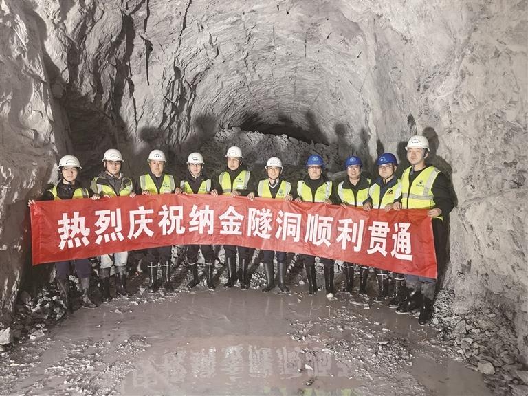纳金隧洞全长5036米,成型断面为城门洞形,宽3.0米、高3.7米,采用钻爆法从两端相向开挖。隧洞穿越中高山地貌,最大埋深约640米,隧洞围岩以Ⅲ类为主,Ⅳ、Ⅱ类次之。自开工以来,项目团队科学组织、精细管理,克服了高海拔隧洞产生的岩爆和集中涌水等恶劣地质环境,严格采取相应支护与封堵措施,连续5个月单侧工作面月进尺超过200米,最高月进尺245米。后续纳金隧洞工程将转入隧洞混凝土衬砌施工,项目部将提前谋划,精心组织,保证施工质量与安全,做好转序工作,确保纳金隧洞首仓衬砌混凝土按计划开仓浇筑。