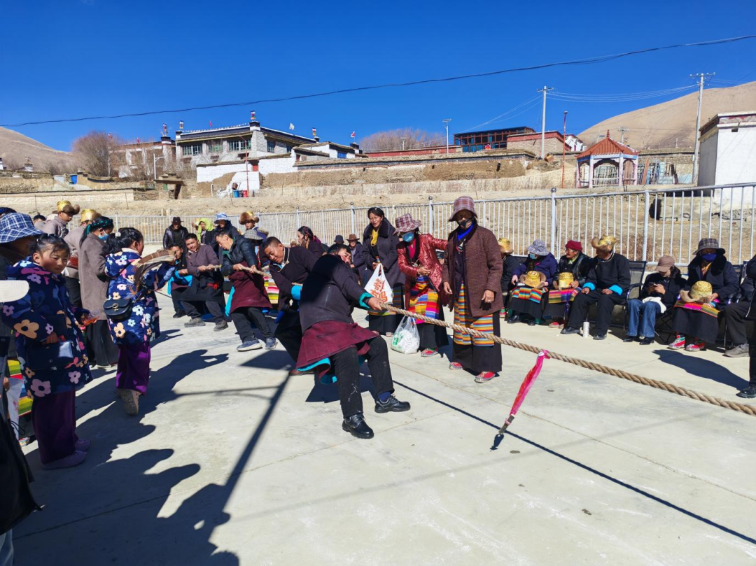 活动现场,由边琼村“拉加贡姆”文艺演出队、库曲村“卓仓阿古行巴”文艺演出队带来欢快舞蹈,以热情的舞步和喜庆的旋律拉开活动序幕,瞬间点燃现场气氛;整场演出既有对中华优秀传统文化的传承,也有对新时代美好生活的热情礼赞,充分展现了边琼村群众文化的蓬勃生机与多元色彩。随后,群众分成若干小组,展开拔河、踢毽子、跳绳等群众喜闻乐见的竞技游戏。