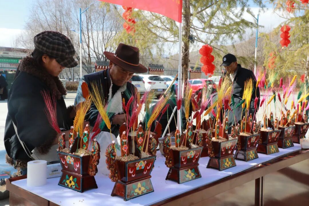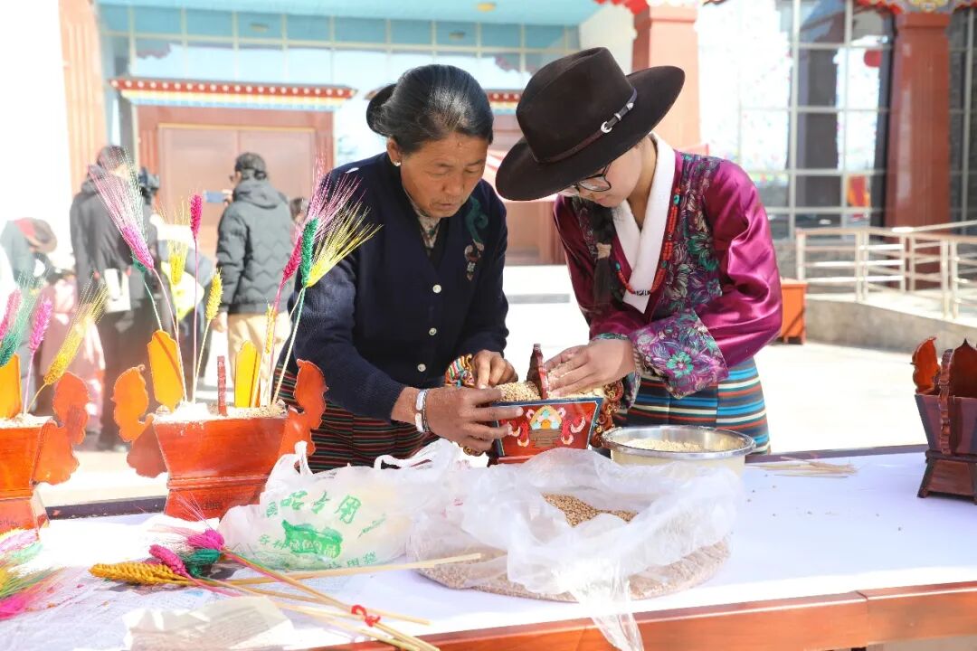 在本次文化体验活动中,国家级非物质文化遗产代表性项目——藏戏成为最大亮点。身着华丽戏服的演员表演了《文成公主》《诺桑法王》等经典剧目片段,生动再现了藏族历史传说与民俗风情。“切玛”制作体验区同样人气高涨,市民和游客在家人陪伴下,将青稞、糌粑、彩色麦粒等材料装入雕花木盒,共同完成这一藏历新年必备的民俗仪式。