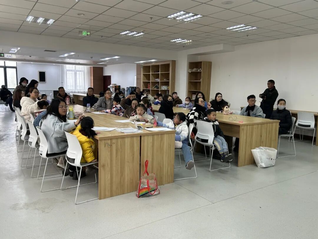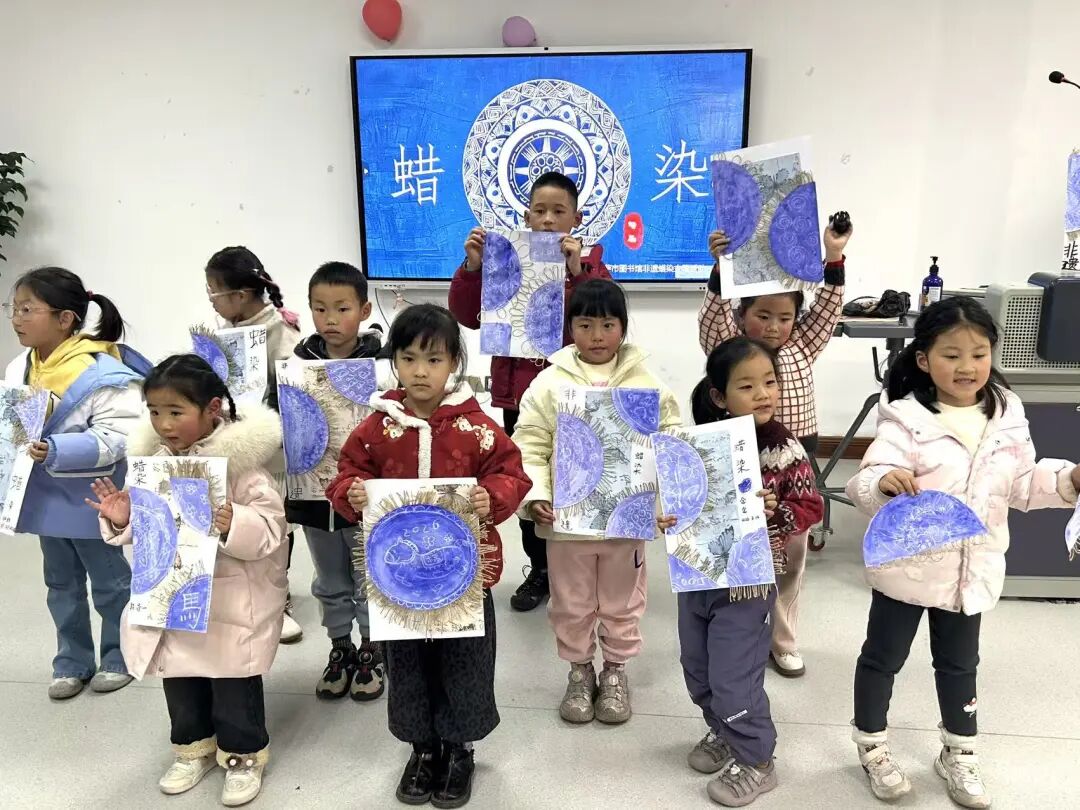 活动的最后,进入了“赏染留韵·雅趣分享”环节。一幅幅蓝白相间、独具创意的油水分离蜡染作品整齐陈列,虽无传统蜡染的精细繁复,却充满了童真稚趣与现代感。在老师的邀请下,几组亲子家庭大方地分享了他们创作过程中的心得体会以及对非遗文化的新认识。随后,所有参与家庭手持自己的作品,在展示区前合影留念,定格下这充满文化韵味与亲子温情的瞬间。