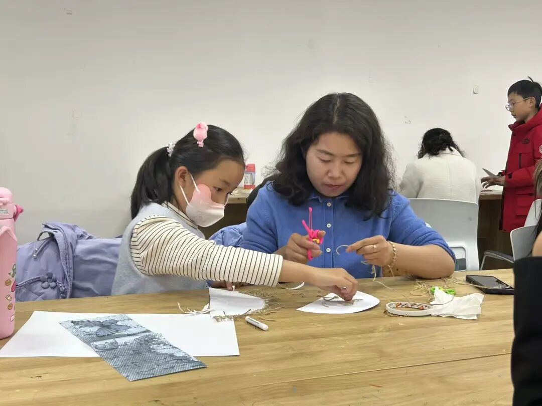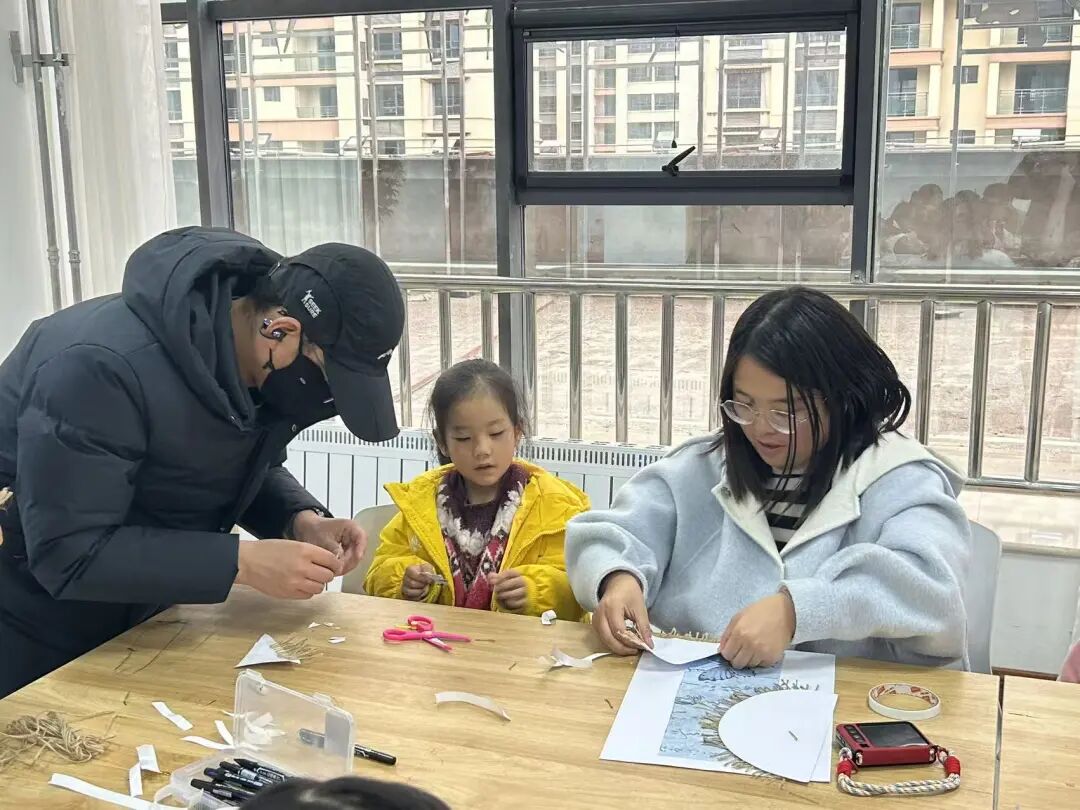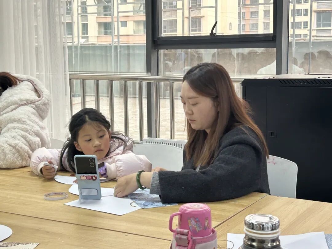 最令人期待的“染韵生香·亲子共创”环节将活动推向了高潮。在老师的指导下,孩子们与家长紧密合作,纷纷化身“小小非遗传承人”。孩子们发挥天马行空的想象力,用白色油画棒在卡纸上描绘出寓意吉祥的日月星辰、花鸟鱼虫,或是充满童趣的现代图案;家长们则在一旁协助,与孩子一起涂抹颜料、调整细节,并在作品完成后,细心地将麻绳穿系装饰。活动现场,有的家庭热烈讨论纹样设计,有的则安静专注地共同绘制,温馨的亲子互动与专注的创作氛围交织在一起。图书馆工作人员和老师巡回指导,不时穿插讲述蜡染相关的趣味小故事,让手工实践的过程始终伴随着文化的传递,使得每一幅作品都凝聚了亲情与匠心。