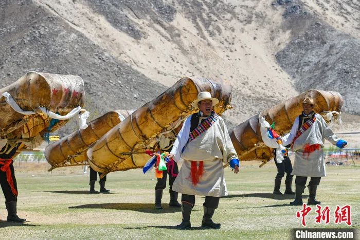 资料图为西藏拉萨曲水县俊巴渔村村民穿着盛装表演牛皮船舞。中新社记者 贡嘎来松 摄