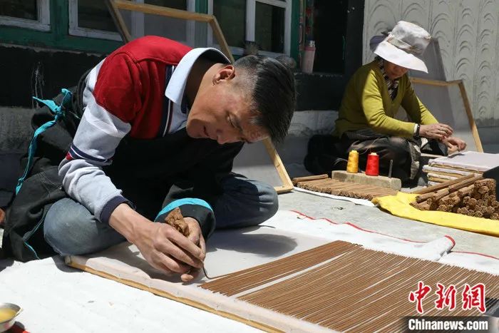 资料图为西藏拉萨尼木县吞巴乡手艺人在自家手工制作藏香。中新社记者 贡嘎来松 摄