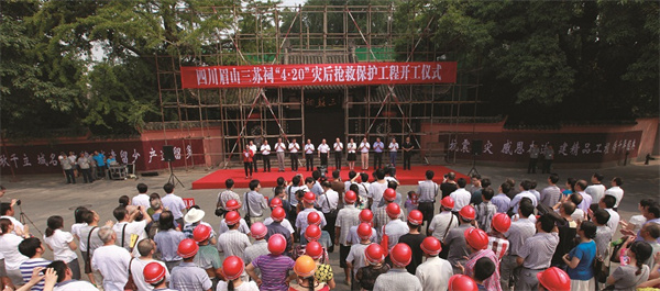 在国家文物局专家组的指导下,完成了文物古建维修方案编制、专家论证等工作,争取灾后重建资金近亿元,其中国家文物保护专项资金6000余万元。国家文物局将三苏祠灾后文物抢救保护工程列为国家灾后文物抢救保护重点项目。2014年至2016年,组织实施对三苏祠古建筑主体、安全设施、水体、山体、桥梁、道路、植被、驳岸、附属建筑、防雷设施、展陈等进行了全面维修、整治和调整。这是三苏祠历史上规模最大、最全面、最彻底的一次维修,从方案设计到施工,按照“保护第一,合理利用”和“原形制、原结构、原材料、原工艺”的原则。在不改变文物原状的前提下,认真查证核实历史依据,以传统工艺为主,适当运用新材料、新工艺,对16处古建筑进行文物本体的全面清理、加固和维修,完整还原了三苏祠的建筑特色和历史原貌。三苏祠文物本体得到有效保护,文物周边环境显著改善。