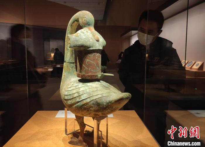 记者在现场看到,西汉时期的彩绘雁鱼釭灯美观又实用,吸引不少参观者驻足欣赏。它由雁首及长颈、雁身及雁足、灯盘、灯罩四部分组合而成,表面施以彩绘,勾画出翎羽、鳞片等,是造型艺术和使用功能完美结合的青铜器佳作。讲解员介绍说,它可以说是2000年前的环保灯,釭灯通过调整灯罩来控制亮度和光照角度,烟尘通过雁首及长颈进入雁身,雁身里面会灌满水,烟尘就会融于水中,不会污染空气。