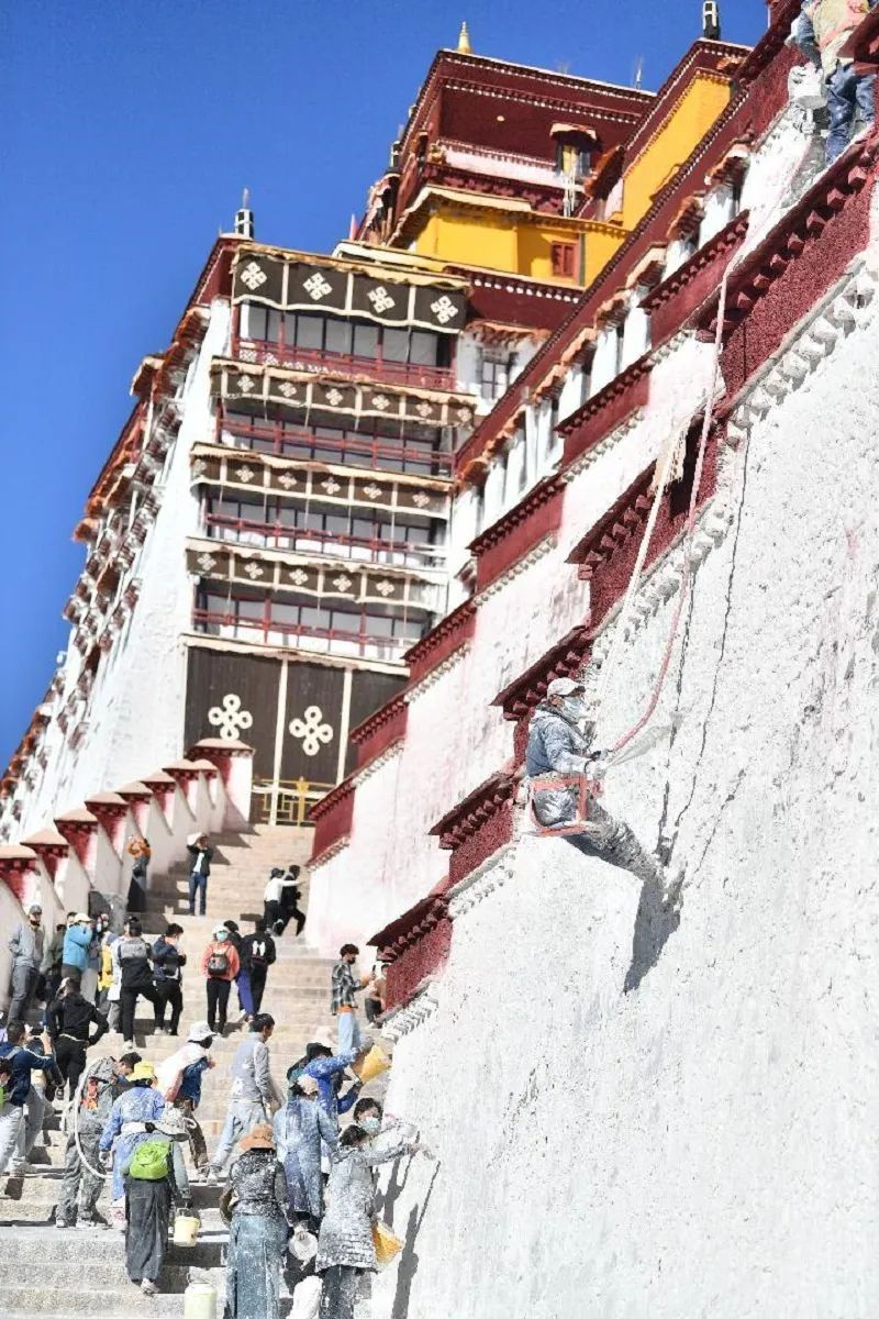 布达拉宫每年一次的墙体粉刷“美颜”工程,都会吸引来自拉萨及西藏各地的信众加入其中,或背运涂料,或搅拌浆水,或亲手刷墙……大家心情欢快,场面动人。