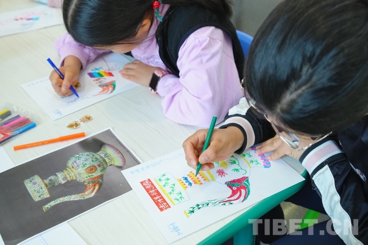 图为参加“周日亲子艺游”活动的学生在画具有藏族文化特色的奔巴壶(图片由澳门艺术博物馆提供)
