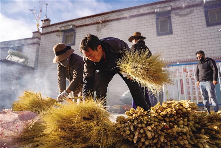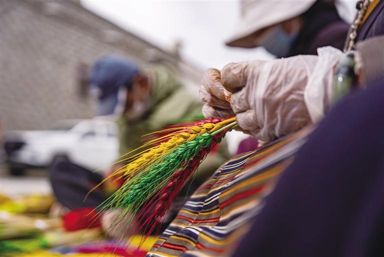 走进桑木村,房屋错落有致,广场上,村民们在冬日暖阳下忙碌着。有的正在煮颜料为麦穗和青稞穗上色,有的正在捆绑晒干的“罗萨梅朵”。“为了方便制作,我们根据外形给这些麦穗和青稞穗起了名字,比如这个秃秃的叫‘古日’,这个最长的叫‘扎日’,还有‘阿索’和‘梅朵’。”64岁的村民其米卓嘎与几位姐妹围坐在一起,一边捆绑“罗萨梅朵”,一边笑着向记者介绍,手上动作丝毫未停。“很多人过年讲究仪式感,会选择买齐这四种,但大部分人会从中选两种。”