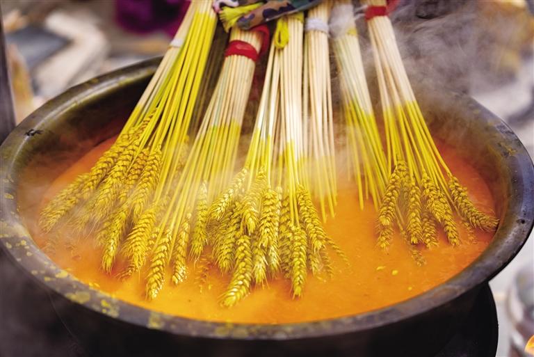 从金黄到色彩斑斓,“罗萨梅朵”的制作需要经过收割、晒干、上色等数道工序,这是桑木村村民传承至今的手艺。热气腾腾的颜料锅旁,年轻的媳妇正在煮颜料;晒干的“罗萨梅朵”堆在一旁,一位奶奶和她的孙子正在有序捆绑。广场上,年龄最大的村民近70岁,最小的12岁,年轻人从老一辈手中接过了文化传承的接力棒。