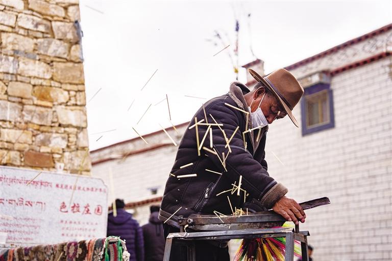 每年12月起,桑木村处处可见“罗萨梅朵”。清晨,天还未亮,村民们就已忙碌起来。有人将制作好的“罗萨梅朵”打包送往拉萨市区售卖,有人则继续为剩下的麦穗和青稞穗上色、晒干。“我从小看着长辈们制作‘罗萨梅朵’,7岁就开始帮忙捆绑,20岁开始独立制作。每到这个时候,我就知道新年快到了。”64岁的村民卓玛次仁回忆道。