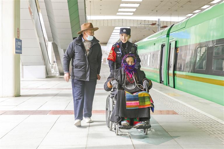 “格桑梅朵”女子乘务组乘警护送老年旅客安全乘车。