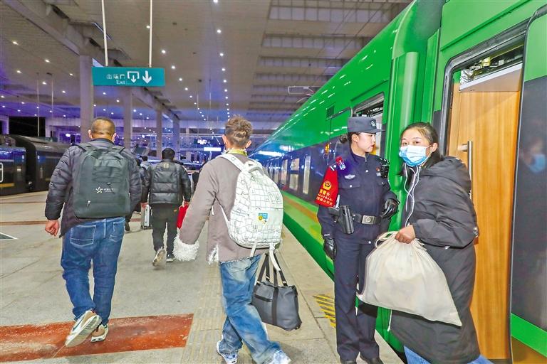 “格桑梅朵”女子乘务组乘警引导旅客平安下车。记者 刘斯宇 通讯员 黄飞 摄